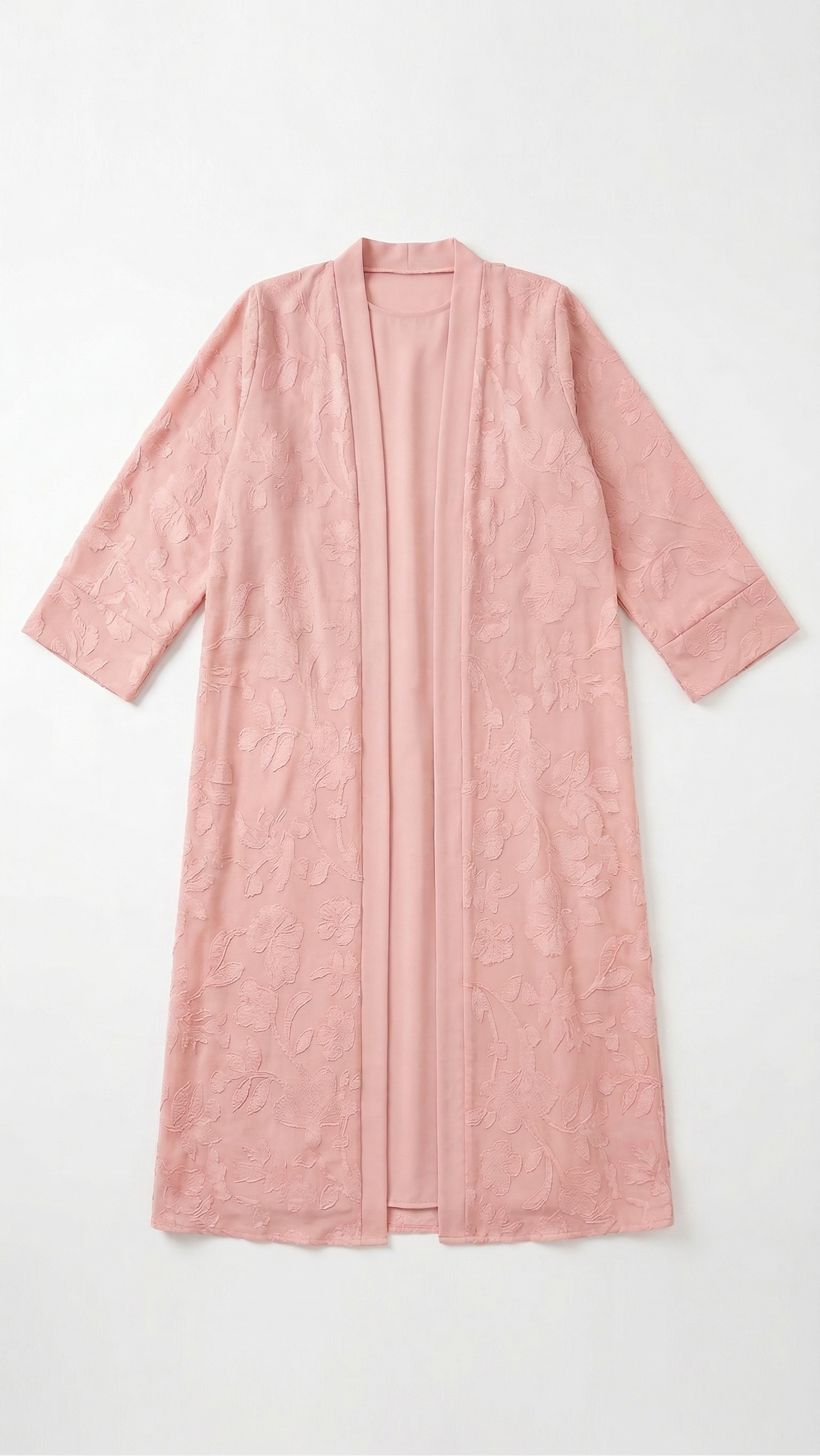 Sublimez votre allure avec cet ensemble kimono élégant Rose. Vendu avec sa sous-robe fluide assortie pour une tenue complète prète-à-porter. Le kimono se distingue par de magnifiques broderies texturées et des manches évasées sophistiquées. L'alliance parfaite de la pudeur, du confort et du chic haut de gamme.