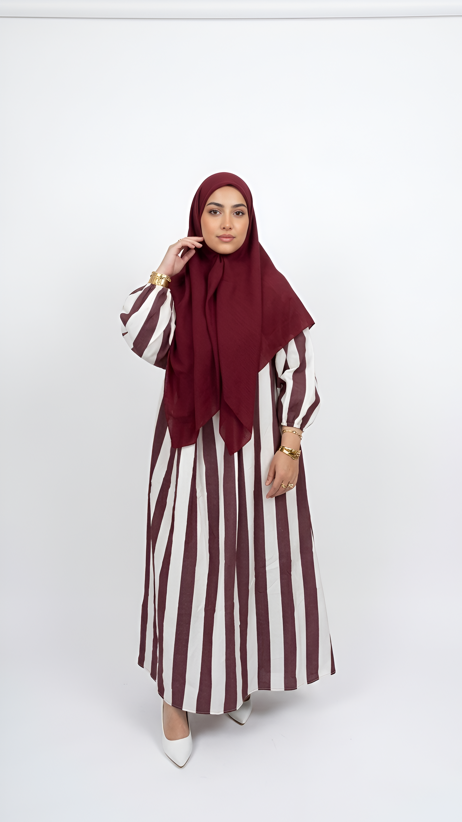 Cette élégante robe longue à rayures bordeaux et blanches, confectionnée en coton est idéale pour les journées d’été. Sa coupe fluide et oversize offre un confort optimal tout en assurant une silhouette flatteuse grâce à son encolure en V et ses manches bouffantes élastiquées. Parfaite pour une allure décontractée-chic, elle se porte aussi bien avec des sandales plats qu’avec des baskets.