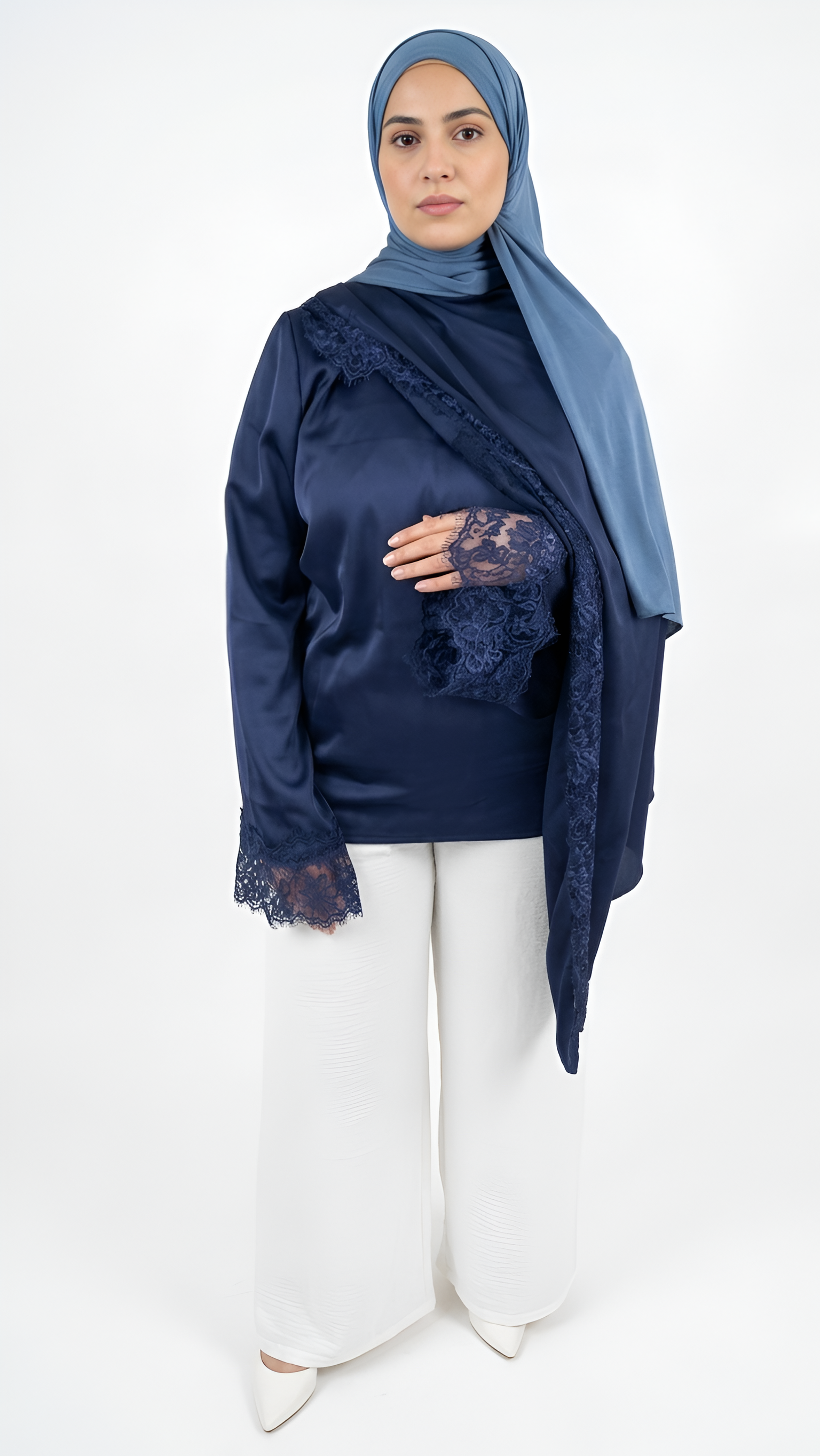 Osez l'élégance avec cette tunique satiné bleu marine aux reflets luxueux, sublimée par de délicates bordures en dentelle sur les manches et l'encolure. Sa coupe asymétrique et fluide couvre élégamment la silhouette tout en dégageant une allure chic et sophistiquée. Le mélange satin et dentelle apporte une touche habillée parfaite pour toutes les occasions. Un haut qui se porte aussi bien en soirée qu'au quotidien, avec un pantalon large ou une jupe longue. L'équilibre parfait entre féminité, raffinement et pudeur.