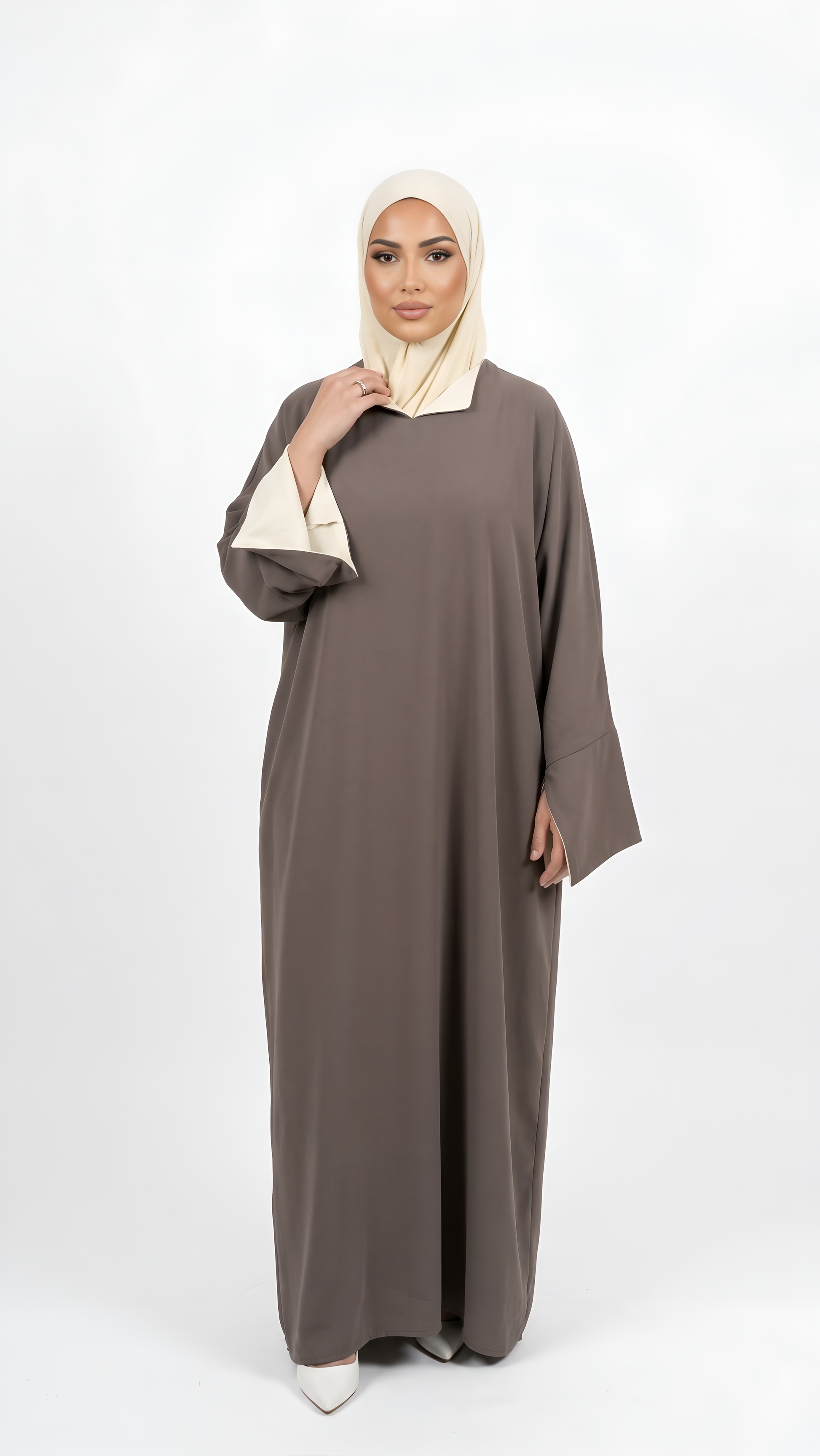 Abaya bicolore élégante associant le taupe et le jaune, dotée de manches à revers distinctives. Confectionnée dans une matière fine et respirante, elle offre un confort optimal pour un port quotidien. Un design moderne qui allie sophistication et praticité.